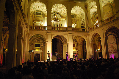 El palacio es una obra de arte del siglo XVI de estilo renacentista italiano. Las Jornadas fueron inauguradas por el Almirante director del Museo Naval de Madrid D. Gonzalo Rodríguez González-Aller. Aparte de la entrega de premios, tuvieron lugar dos magníficos conciertos en el patio interior del palacio: uno con el Coro de Voces Graves de Madrid, el viernes, y otro con Hexacorde y Vanesa Muela (aparecen en la fotografía), al día siguiente.