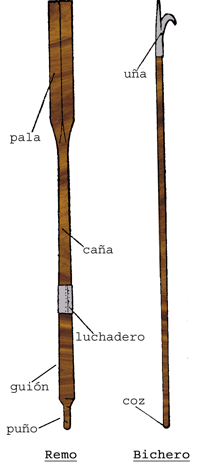 Remo. Palanca de madera flexible, la mejor es la de haya, que apoyada sobre la chumacera, sirve para hacer fuerza sobre el agua impulsando la embarcación.