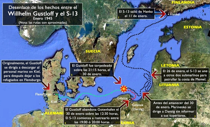 El capitan del S-13, Alexander Ivanovich Marinesko (imagen), llevaba ya dos semanas en el Báltico a la búsqueda de un éxito que le evitase un proceso militar por falta de disciplina. Finalmente, aquel 30 de enero, a las 20:00 horas aproximadamente, recibió la noticia de que se había avistado un gran buque de transporte de tropas.