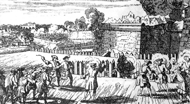 La ilustración representa a unos granaderos atacando un camino cubierto. Son de destacar las bolsas granaderas y el humo de las espoletas de mixto de las granadas.