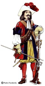 La ilustración que encabeza esta entrada representa un soldado de la Infantería de Galeras de la época de Carlos II. Viste casaca de mangas cortas y grandes vueltas, que dejan ver las mangas de la camisa; calzones greguescos de paño amarillo (muy en boga en ese tiempo); medias rojas; zapatos de vaqueta y corbata de bocadillo. Se cubre con un chambergo blanco, adornado con pluma roja y lleva guantes de ante. El color de la casaca (rojo) y el de las vueltas y solapas (azul) es imaginativo. Usa pelo a lo “nazareno”, con grandes bigotes y “mosca”. Cruzan su pecho dos talabartes de cuero; de uno cuelga la espada de lazo y patilla; del otro las cargas de pólvora (los doce apóstoles) para su arma. Como está preparado para la función en tierra, porta mosquete (más pesado y de mayor calibre que el arcabuz que se empleaba a bordo, por lo que necesitaba una horquilla de apoyo), en el cual podemos distinguir la llave de “serpentín” y el largo disparador. Con la mano derecha sostiene la horquilla del mosquete y la cuerda mecha que, una vez encendida, se colocaba en el serpentín. Dado que hemos querido representar a un granadero, en el dibujo se ve, asomado bajo el guante derecho, la bolsa granadera.