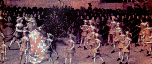 La imagen corresponde a un fragmento del cuadro titulado «Auto de fe en la plaza de Zocodover de Toledo». El campo de la bandera parece ser compuesto de jironados y cuartelados, y su tamaño corresponde a unos 2 x 3 m.. Este tamaño obligaba al alférez a sujetar el extremo con la mano izquierda e, incluso, a recogerla bajo el brazo, descansando la punta sobre el antebrazo. Los soldados que aparecen son piqueros y visten chambergo, coleto de cuero con rica valona, greguescos pardos y medias blancas. Ciñen la cintura con una faja roja (color distintivo de España) y llevan espada de taza.