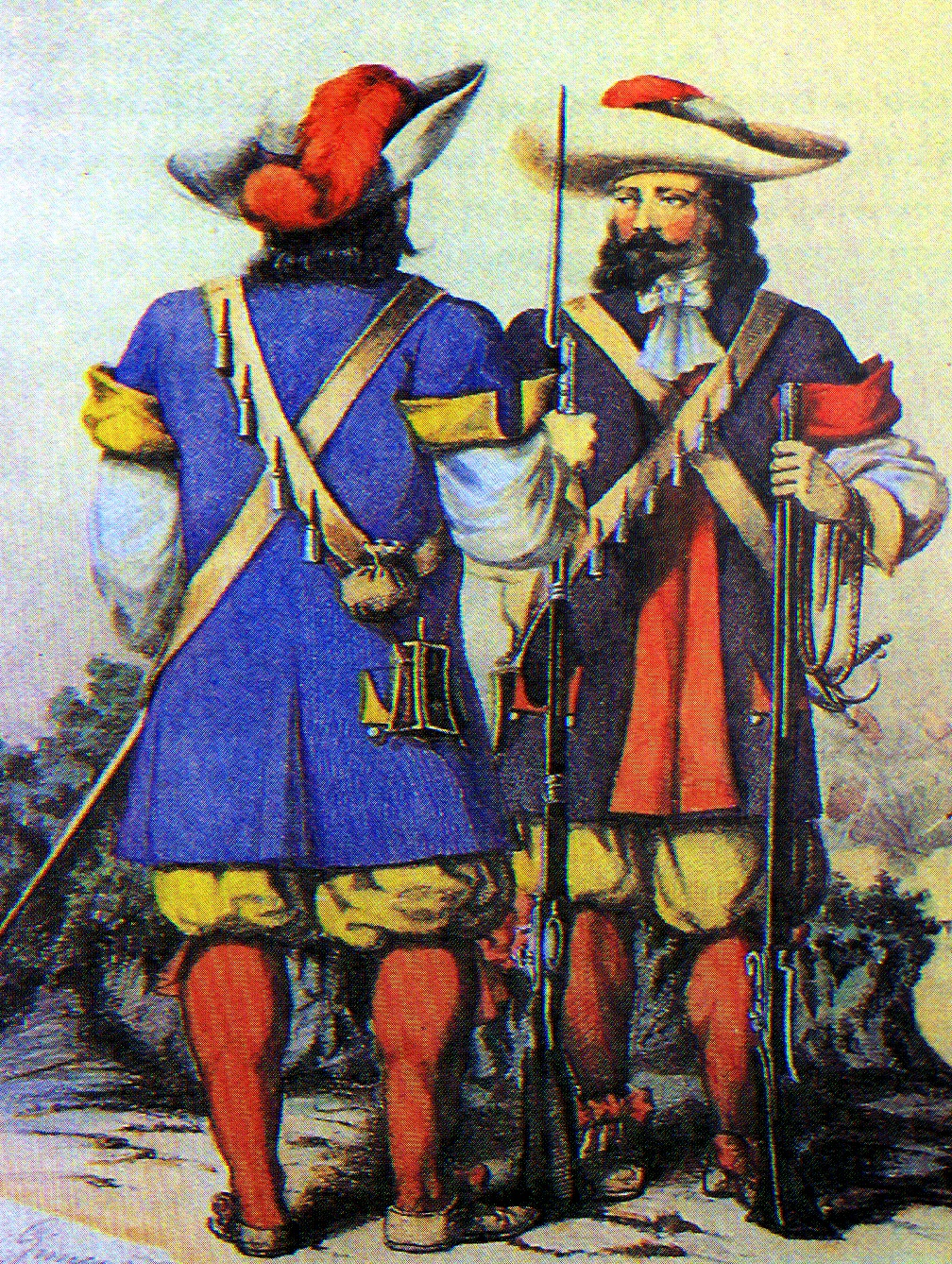 En esta vieja ilustración tenemos, de espaldas, un granadero (reconocible porque usa fusil) y un arcabucero (si fuese un mosquetero, el arma sería más gruesa, y el soldado llevaría en la otra mano la horquilla para apoyar el mosquete). Aunque la reconstrucción histórica tiene algunos errores, que iremos comentando, es útil para hacernos una idea de la uniformidad y de las armas de este período. Así podemos ver: los chambergos, de tonos blancos, adornados con una pluma roja; las cabezas de los soldados, con el cabello a lo “nazareno”, los grandes bigotes y la perilla o mosca; la corbata blanca, de lienzo de bocadillo; la casaca, con las solapas en la parte frontal y las mangas con sus vueltas (éstas algo desproporcionadas, pues las vueltas deberían ser mayores y arrancar desde el codo); los gregüescos amarillos y las medias rojas.
