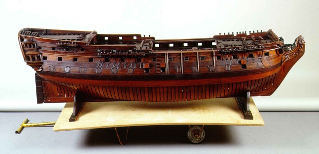 En este sistema se realiza una variación con respecto al anterior. Ateniéndonos al modelo que hay en el Museo Naval de Madrid, observamos que las tres mesas de guarnición están en la misma línea, por encima de las portas de la segunda batería, aproximadamente a la altura de los baos que hacen de base del alcázar y castillo del buque.