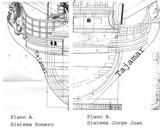 En este punto hay una diferencia sobresaliente, el tajamar del modelo del Museo Naval de Madrid es del tipo “a la inglesa”, sistema Jorge Juan. Parte desde el pie de roda y tiene un lanzamiento superior a lo que se especifica en los planos del sistema de Romero de Landa.
