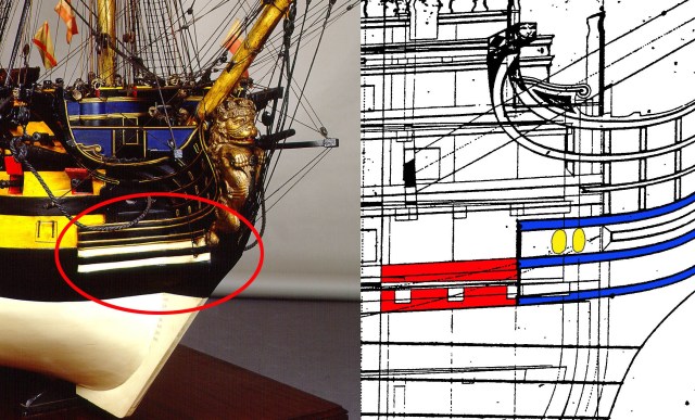 En el modelo del museo hay irregularidades, a primera vista la colocación de los escobenes es totalmente ilógica, ya que está casi centrado con respecto a la segunda cinta, es decir, prácticamente en línea con los baos de la segunda cubierta.