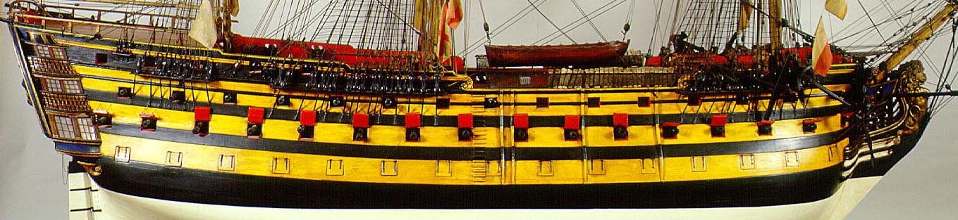 Primera batería. El número de portas es coincidente con el plano, pero no su posición. La primera porta a proa empieza a la altura del trinquete según los planos del navío, y no como está representada en el modelo.