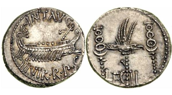 La segunda moneda representa una nave de guerra (navis longa o navis constrata). La moneda está en buen estado y presenta muchos detalles. La embarcación, dado que los remos están presentados simbólicamente, debe ser una birreme (biremis), aunque podría ser también una trirreme (triremis). Empezando por la derecha aparecen, en la proa (o prora), el ariete (o rostrum) de bronce, empleado para hundir las naves enemigas; el corvo (o corvus), especie de puente giratorio y abatible con un fuerte diente de hierro en su extremo, que se dejaba caer sobre la cubierta enemiga (o fori), permitiendo el abordaje de los legionarios romanos embarcados; los remos (remus); el timón, y el aplustro (aplustre), especie de adorno recurvado hacia la proa. Es de destacar que la nave va desarbolada, es decir, que ha abatido el palo mayor y lo ha estibado en cubierta. También ha retirado el artimón.