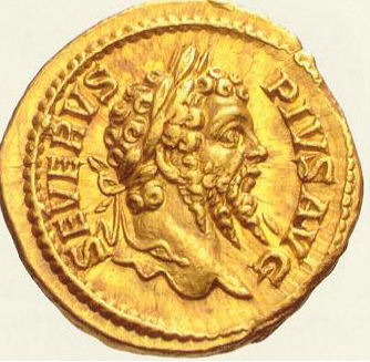 La tercera moneda, un aureus conmemorativo de unos juegos, es muy interesante porque reproduce una embarcación de las empleadas en las naumaquias, representación de combates navales, que se celebraban en el anfiteatro o en lagos ex profeso. La embarcación está representada de forma somera, aparece el timón, el timonel (gubernatur), el árbol con la vela, el caperol de proa y diversos artefactos no identificados sobre la cubierta. La pieza presenta además figuras alusivas a los juegos, como cuadrigas y animales salvajes.