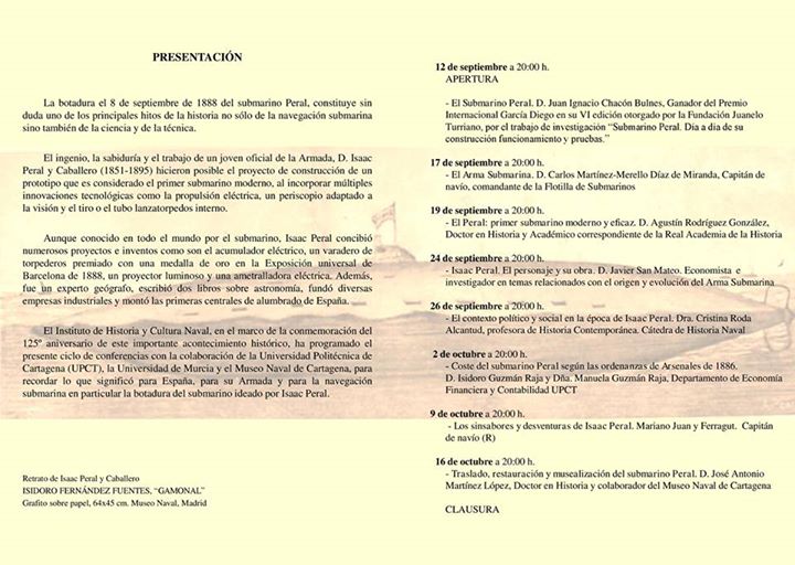 En septiembre se cumplen los 125 años de la botadura del submarino de Isaac Peral. Por ello la Armada Española, a través del Órgano de Historia y Cultura Naval, junto con otras instituciones entre las que se encuentra la Cátedra de Historia Naval, van a realizar una serie de actividades (conciertos, emisión de moneda, concurso de fotografía, travesía, etc., de las que daremos más información en fechas próximas). Entre éstas se celebrará en Cartagena, donde nació Peral, un ciclo de conferencias en conmemoración de dicho acontecimiento.
