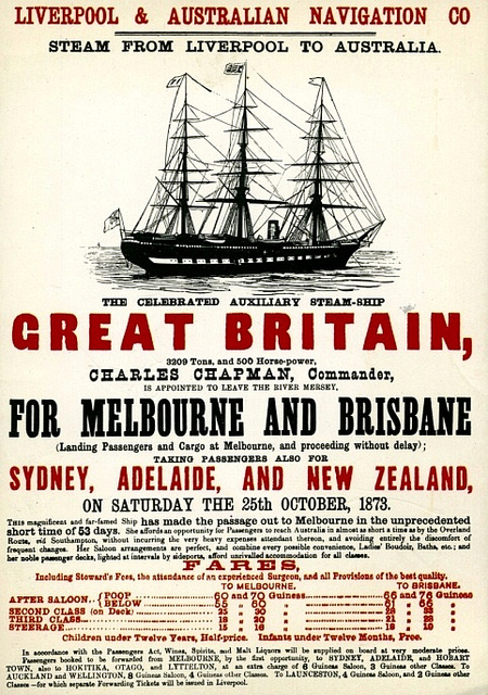 El SS Great Britain pasó entonces a realizar la mayoría de sus viajes entre el Reino Unido y Australia. En 1852 realizó su primer viaje hacia Melbourne (Australia), transportando 630 emigrantes. El interés por el barco fue tan grande en la ciudad que aproximadamente 4000 personas pagaron un chelín para verlo.