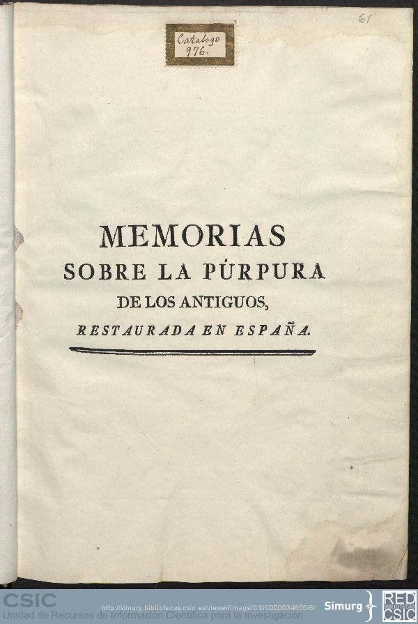 – Unas magníficas Memorias sobre la púrpura de los antiguos restaurada en España, de Canals y Martí, publicadas en 1779. La púrpura es el molusco del que procede el tinte del mismo nombre.