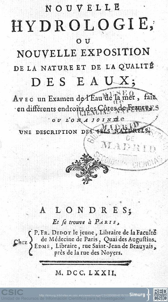 – Nueva Hidrología, o Nouvelle Hydrologie, ou Nouvelle Exposition de la nature et de la qualité des Eaux ; avec un examen de l’éau de la mer, fait en différens endroits des Côtes de France, ou l’on a joint une description des sels naturels, de Antoine Grimoald Monnet, publicado en Londres en 1772.