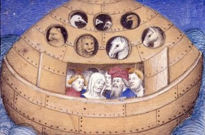 Description: (Miniature only) Noah’s ark shown as a round, domed vessel, with birds and animals peering out of the portholes, with Noah and his family staring through a large opening on the main deck below.
