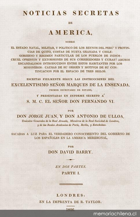 Un ejemplar de las famosas Noticias Secretas de América de Jorge Juan y Antonio de Ulloa publicado ya en el siglo XIX.