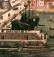 Amarradas a “la mediterránea” al muelle hay otras dos naves mancas (que solamente navegan a vela), iguales a la anterior. Una de ellas tiene la verga mayor con la vela todavía envergada, apoyada en la regala de la borda, lo cual era muy usual en esa época, pues evitaba tener que subir a lo alto para desenvergar la vela.