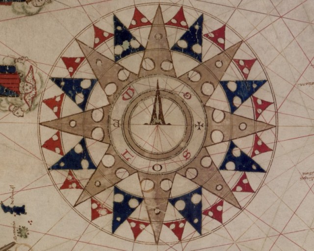 La araña del portulano, como cualquier carta plana mediterránea lleva un surtido de rosas, ombligos y nudos, que servían para trazar un rumbo y la derrota estimada compasando (utilizando el compás).