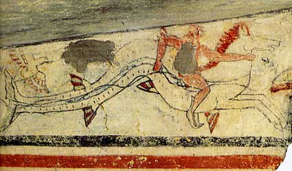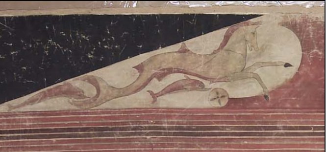 Un ejemplo son los de la Tumba del Barón. En una escena ritual, hay un frontispicio en el que unos bellos caballos marinos, dispuestos simétricamente, galopan sobre la superficie acuática, acompañados por delfines. Estos hipocampos solían ser de tonos rosáceos y son distintos de los griegos porque poseen patas delanteras de caballo terrestre, aletas a lo largo de su cuerpo, así como una elegante y sinuosa extremidad ictioforme.