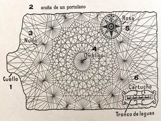 - El ombligo, punto principal de la construcción de la carta. Debido a las irregularidades de la costa se solía usar varios ombligos repartidos convenientemente, incluso algunos colocados sobre tierra firme.