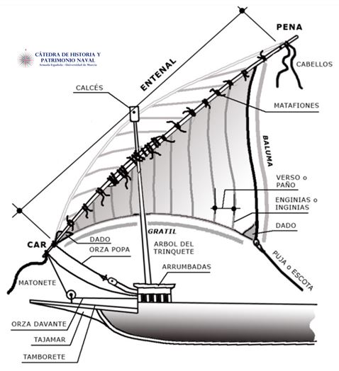 Volviendo sobre las velas, veamos la estructura de la entena. Especialmente interesante es el espigón, que servía para alargar la pena y envergar la vela de mayor tamaño de las dos que tenía el árbol de mestre, que contaba también con una vela cuadra, el treo, para correr fortuna.