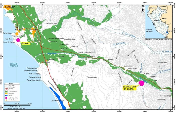 Perú, la cuna de las mil culturas, la zona del mundo donde se están descubriendo los más insospechados pueblos, es el lugar en el que se desarrolló esta civilización, cuyo centro neurálgico fue Caral, hace unos 5000 años. En concreto en un lugar entre la costa del Pacífico y las montañas andinas.