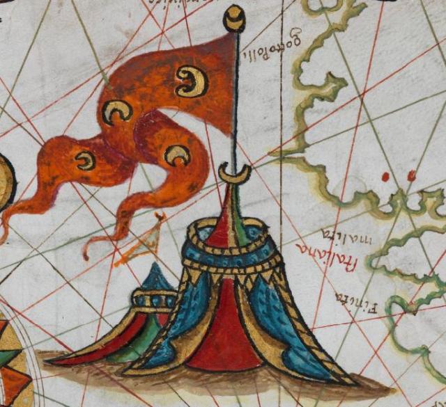 Una de las representaciones que más llama la atención, aparte de las rosas de los vientos y los escudos, es la aparición de tiendas de campaña lujosamente iluminadas, muy al estilo oriental. Muy influenciada por el misticismo medieval, la tienda se presenta como objeto estético digno de admiración, por lo que se dibuja y otorga protagonismo en esta carta. Se construía con los mejores materiales y su porte se corresponde con la categoría de sus componentes. La suntuosidad, la amplitud espacial y la maestría de los dibujos ya habían manifestado en otra época el poder de Adrasto, el rey de Argos o del gran Alejandro Magno (Rubio Tovar).
