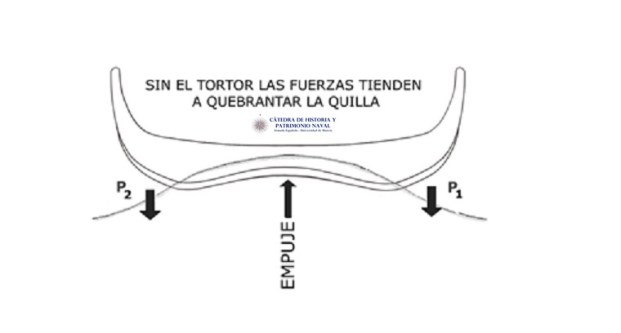 Este fenómeno era más corriente en el Mediterráneo que en otros mares, dado que en éste la ola del mar es “corta”, es decir que la distancia entre dos olas, a igualdad de altura, era menor que en otros mares, lo cual se traducía en que la pendiente de la cresta hacia el seno era más acusada, aumentando el riesgo del quebranto. Para solventar el problema se unía la proa con la popa con un fuerte cabo doble, el tortor, al cual se le daba tensión retorciéndolo (o agarrotándolo) sobre si mediante una palanca de madera, el garrote. Las primeras representaciones que conocemos de embarcaciones con el uso del tortor, son las del faraón Sahure (c. 2700 a.C.).