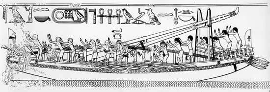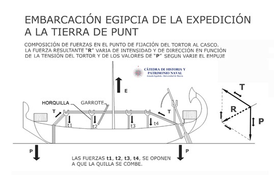En la siguiente figura se ha representado una de las naves de la expedición a la tierra de Punt de la reina Hatshepsut (c. 1500 a. C.), con la composición de fuerzas que evita el quebranto.