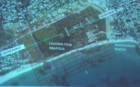 Plano de la antigua ciudad de Neápolis, que ocupaba lo que hoy es zona costera terrestre y otra actualmente sumergida en el mar