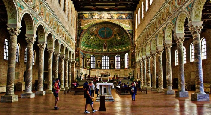 La Basílica de San Apolinar fue construida a principios del siglo VI y posteriormente dedicada al primer obispo de Rávena. Debió estar completamente decorada con teselas y pinturas murales, pero una parte importante desapareció durante las reformas del siglo XVI. Los mosaicos que quedan narran escenas religiosas y entre ellas aparece la del puerto.