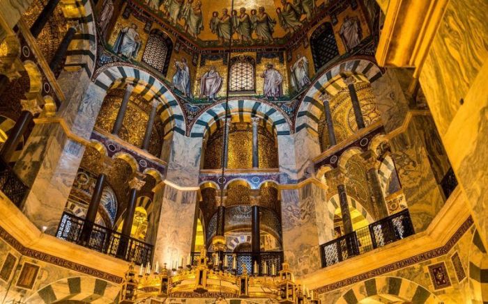 Cuando el gran Carlomagno, el rey de los francos, en el siglo VIII, se reivindicó como sucesor del Imperio romano, se inspiró en los edificios, en los paisajes de Rávena para construir su nueva y espléndida capital en Aquisgrán (abajo aparece una imagen del interior de uno de los edificios más lujosos de esta nueva urbe), dando paso al imperio carolingio, que unió lo que hoy conocemos como Europa central bajo su mando.