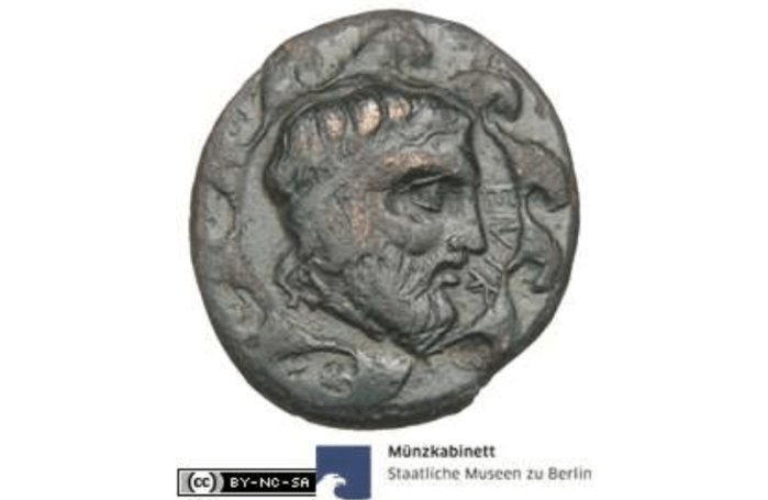 Moneda griega en la que aparece Poseidón y se nombra a la ciudad de Hélice. S. IV a.C. Fuente