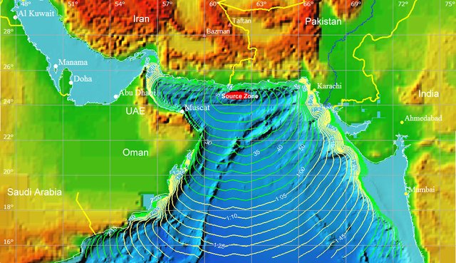Efectos del movimiento tectónico que causó el tsunami de Makran en 1945. Fuentes: Mokthari 2019 y Heidarzadeh, 2015