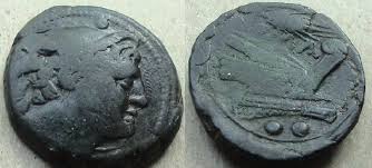 b) los aes, la moneda central, que pesaba 12 onzas de bronce y llevaba acuñada la imagen de Jano (el de las dos caras, guardián de las puertas) en el anverso. La proa solía ir sola, aunque a veces llevaba también el nombre de Roma.