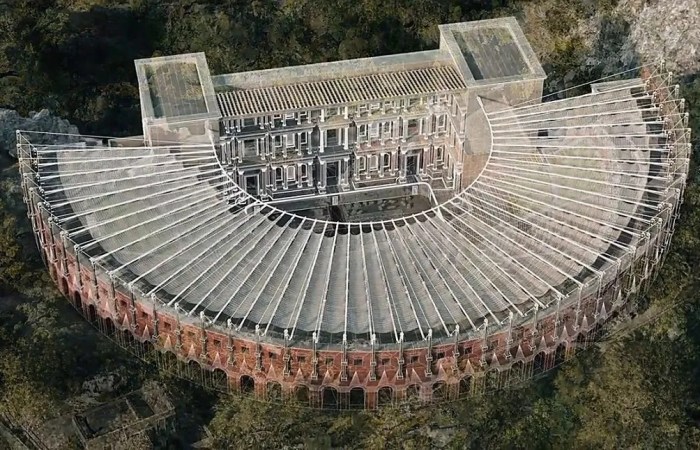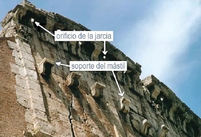• Por una parte, han hallado los salientes donde se podían apoyar unos postes altos que sobresalían de la parte superior del anfiteatro (a modo de mástiles), Los enormes palos (a modo de mástiles) iban anclados firmemente a la pared exterior del edificio.