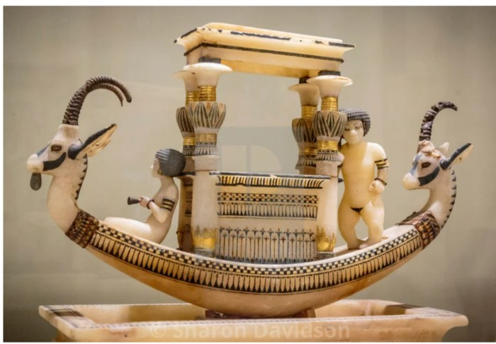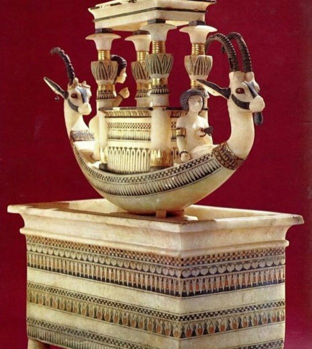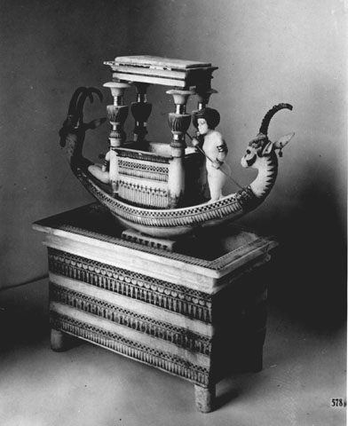 Esta pieza se halló casi intacta en el suelo de la tumba. Es muy frágil, ya que está hecha de calcita semitransparente, y mide unos 70 cm. de alto x 71 cm. de longitud. Descansa sobre un mueble con cuatro patas cilíndricas, que en su extremo superior porta un recipiente cuadrado para contener agua. Sobre esa pequeña pileta se sitúa, en un pedestal, una barca muy decorada que está tallada, grabada y pintada con guirnaldas de frutos y flores.