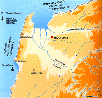 Su posición hizo que necesitara ser defendida, por lo que muy pronto se erigieron las murallas para protegerse de las sucesivas ocupaciones. Hay que señalar que en la época homérica Troya estaba muy cercana al mar, tal y como se puede apreciar en la imagen siguiente, y que existía una enorme bahía, hoy colmatada, que permitía que las naves pudieran entrar hasta la misma ciudad. También varios ríos conectaban con dicha bahía y generaban un gran sistema fluvial que facilitaba la navegación hasta las puertas de Troya.