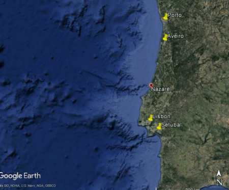 El origen de las olas monstruosas de Nazaré está vinculado a su topografía marina única. A unos 160 kilómetros de la costa de Lisboa, emerge el cañón submarino de Nazaré, que desciende hasta el fondo del lecho marino. Este cañón se extiende a lo largo de unos 230 kilómetros, y su profundidad alcanza cifras impresionantes, llegando a superar los 5000 metros en algunas áreas.