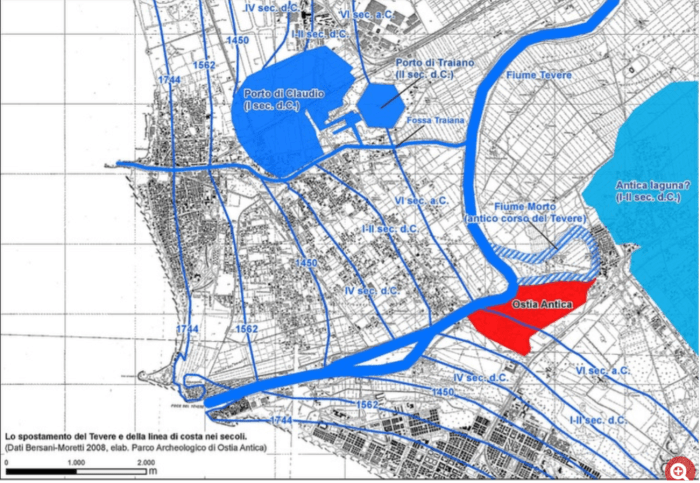 La antigua ciudad de Ostia-Antica, situada en la desembocadura del río Tíber, y actualmente situada a unos 30 kilómetros al sudeste de la ciudad, desempeñó un papel fundamental como puerto de Roma durante el apogeo del Imperio. Fue fundado, según la leyenda, por Anco Marcio, el cuarto rey de Roma y último de origen sabino, en el siglo IV a.C. con el objetivo de extraer fácilmente sal del mar Tirreno. Con el paso de los años, Ostia se convirtió en un importante centro de comercio y actividad marítima, esencial para el suministro de la capital imperial. La ciudad, que surgió y desarrolló con el puerto, fue planificada y concebida según los cánones imperantes en Roma, con calles rectas y cruces en ángulo recto formando un patrón de cuadrícula.