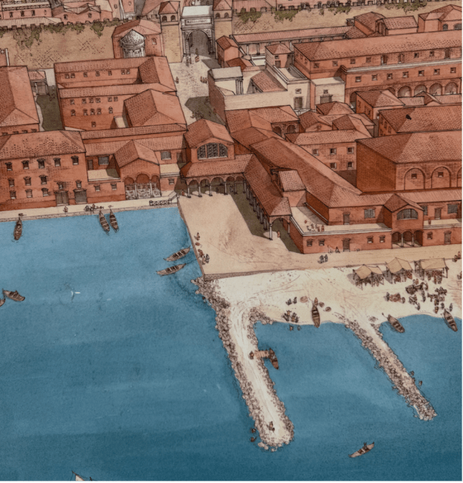 La primera infraestructura portuaria fue interior y era conocida con el nombre de Portus Tiberinus. Se trata del primer asentamiento portuario a lo largo del Tíber, en la ciudad de Ostia, que servía principalmente para el amarre de pequeñas embarcaciones fluviales que transportaban mercancías hacia y desde la ciudad de Roma. Esta parte del puerto estaba equipada con almacenes, denominados “horrea”, donde se almacenaban y guardaban diferentes productos como grano, aceite y vino; fundamentales para la alimentación de la creciente población urbana.