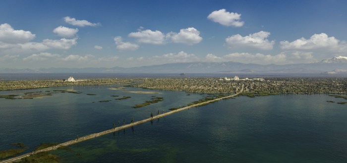 Cuando la población empezó a crecer, se hizo necesario desarrollar una serie de infraestructuras para proporcionar servicios que hoy llamamos básicos, como por ejemplo acceso al agua potable, que se tenía que transportar en canoas desde la orilla del lago a la ciudad.