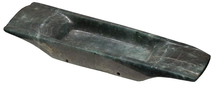 Las pequeñas canoas son de diferentes tamaños, aunque están hechas con una técnica similar y el patrón de diseño utilizado en ellas es parecido. El jade empleado es de buena calidad y algunas cuentan con perforaciones, por lo que se cree que se usaron como pendientes.