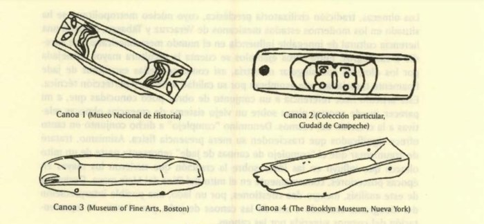 Hasta el momento se tiene noticia de cuatro pequeñas canoas, actualmente depositadas en museos y colecciones privadas. La del Cerro de las Mesas (nº 1 en el dibujo) se encuentra en el Museo Nacional de Antropología e Historia de México; la segunda procede de Isla Piedra y está en una colección particular en la ciudad de Campeche; la tercera canoa se localiza en el Museo de Artes de Boston y la cuarta está en el Museo de Brooklyn, en Nueva York.
