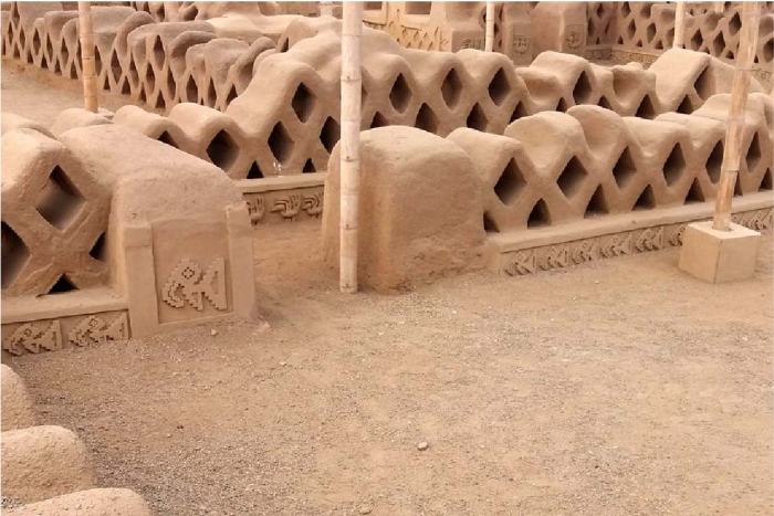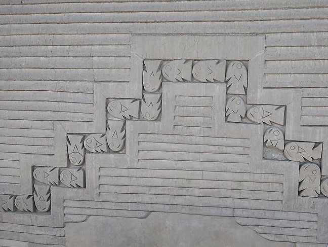 En los corredores de acceso muchas veces encontramos la base con una representación espiral (las olas), acompañada de una serie de rombos (las redes de los pescadores chimúes) y de peces.