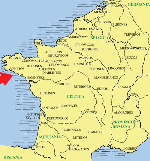 Durante la época romana, en el siglo I a. C., uno de sus líderes militares más conocidos, Julio César, se enfrentó con un pueblo costero de origen celta que habitaba en la actual Francia, en la península de Bretaña. Hoy se conocen como vénetos, pero César los llamaba vaneses, por una de sus ciudades más conocidas, Vannes. En una entrada anterior hablamos de los barcos de este pueblo, famoso por sus intrépidos marineros y sus audaces técnicas de construcción naval.