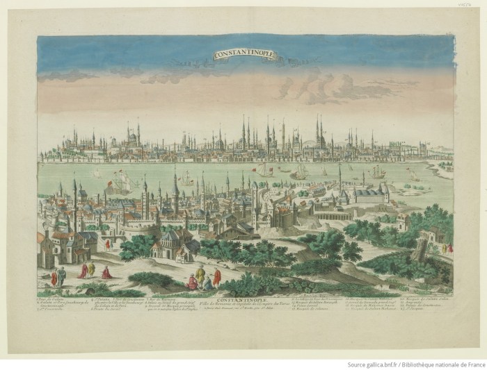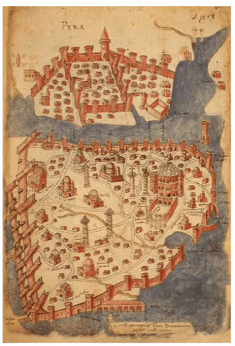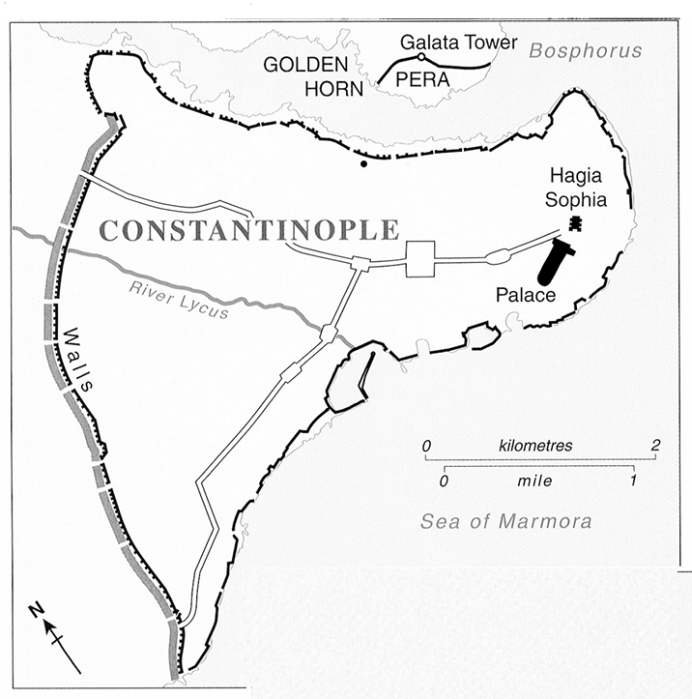 La urbe estaba dividida en dos núcleos costeros situados a ambos lados del estrecho del Bósforo, entre el mar de Mármara y el mar Negro. En la parte norte estaba el barrio de Pera, también llamado Gálata. Desde ambos lados se sujetaba una enorme cadena, defendida con torres artilladas, que impedía el acceso de naves al estuario (conocido como el Cuerno de Oro, Golden Horn en las figuras), lo que protegía una parte de la ciudad contra ataques navales.