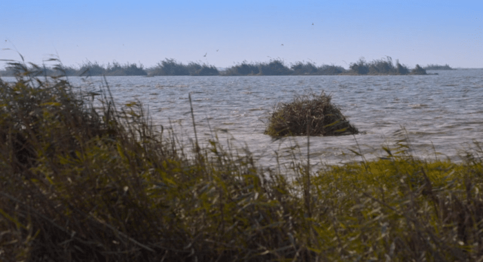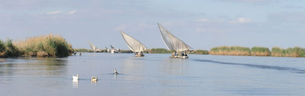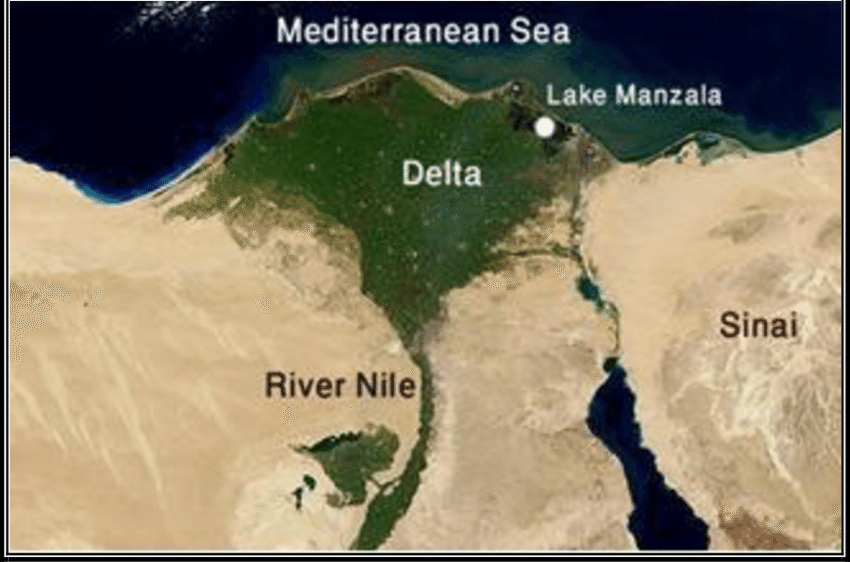 El lago Manzala es uno de los más grandes en Egipto. Se extiende por unos 60 kilómetros y tiene 40 km de ancho. Está muy cercano al mar Mediterráneo, en el enorme delta del Nilo. Es salobre (mezcla de agua dulce y salada) y poco profundo.