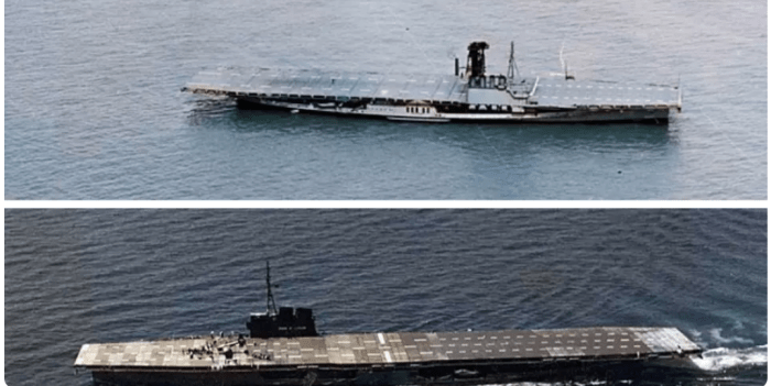 Tuvieron que instalar enormes cubiertas en la parte superior de las naves, para imitar la plataforma de lanzamiento de los portaviones auténticos.