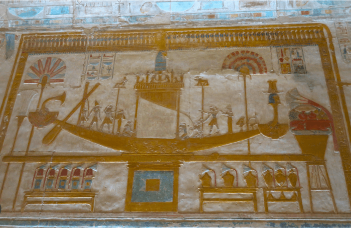 Los viajes por motivos devocionales eran frecuentes en el Antiguo Egipto y tenían carácter de peregrinación. Uno de ellos consistía en la celebración de festivales anuales que recreaban el drama de la muerte y resurrección de Osiris, en la ciudad sagrada de Abidos. Fue en este centro, según la mitología, donde se encontraba la tumba del dios que presidía el mundo de los difuntos. Según sus creencias, estos podían acudir en una barca mágica a participar en los festivales.
