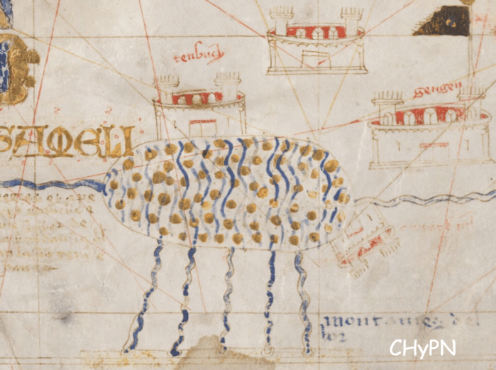 El cartógrafo mallorquín también representó algunas regiones septentrionales del Atlántico apenas cartografiadas. Frente a Islandia dibujó la caza de la ballena.